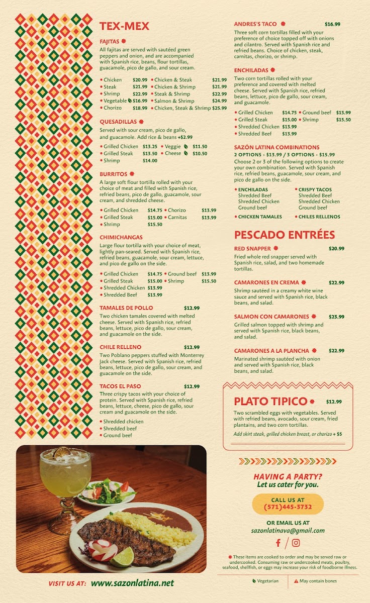 Welcome to Sazon Latina Salvadorian & Tex-Mex Food, where vibrant flavors of El Salvador meet Tex-Mex favorites! Located in Gainesville, VA, this culinary gem spices up the local dining scene with its authentic menu. Start your meal with the national dish—Pupusas, made from masa harina and cheese, with options like refried beans or pork. Pair it with crunchy pickled cabbage slaw for a refreshing crunch.