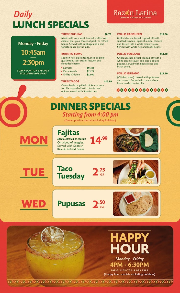 With daily specials and a unique brunch menu, Sazon Latina promises something for everyone. Indulging here feels like embracing a piece of Salvadorian culture—extraordinary, flavorful, and true to its roots. Don't miss out on this local treasure!
